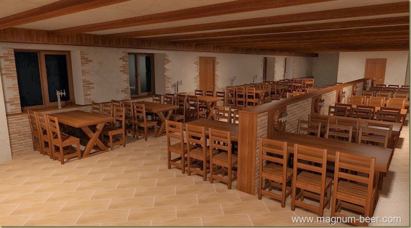Ресторан изначально проектировался под розлив пива напрямую на столики. Исключительно самообслуживание, розлив с барной стойки не предполагался. В проекте ресторана были заложены каналы под пивопроводы, перегородка посередине зала и фальшстена у окон (все с удобными съемными панелями) для установки узлов учета и пивных кранов. Вот так выглядел дизайн-проект.